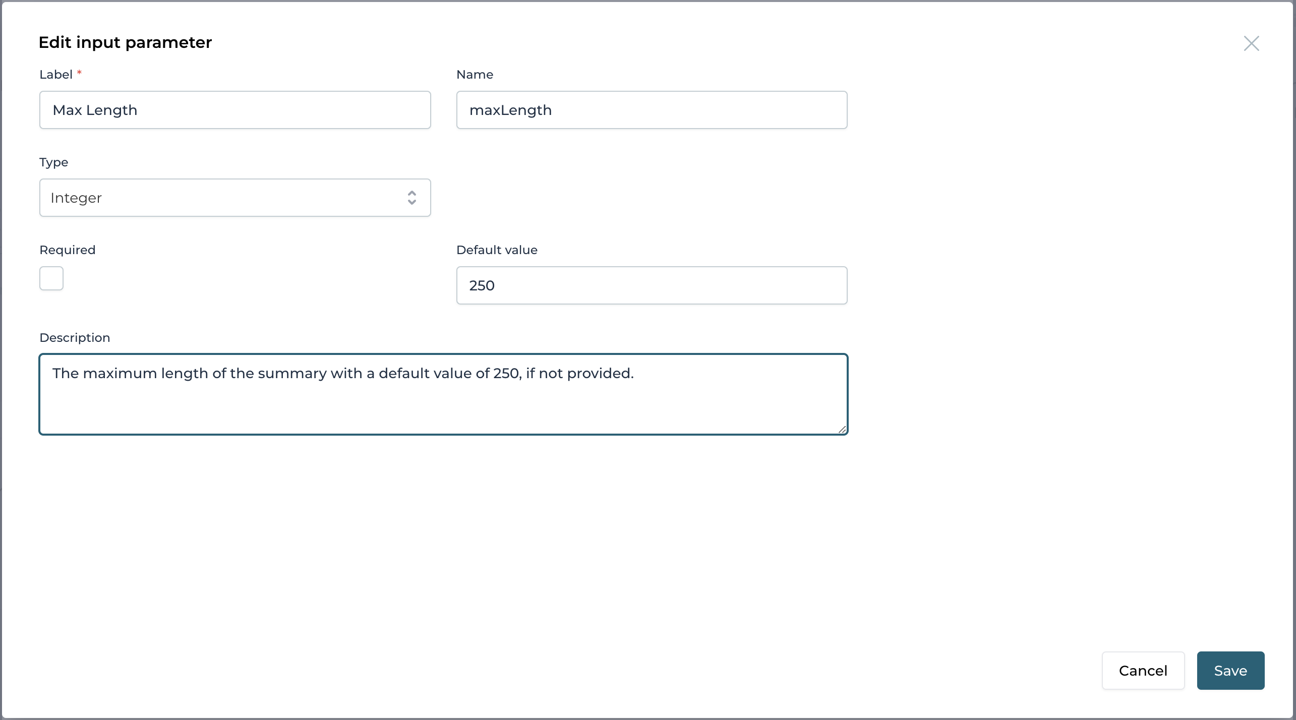 As you can see, we can define quite a lot for output parameters like what happens, if there is no value provided or is empty and so on. For our example, we only have one and that one is required as otherwise the service does not make any sense, but as we will see later, we can also play with default values, if AI is not providing any outcome.